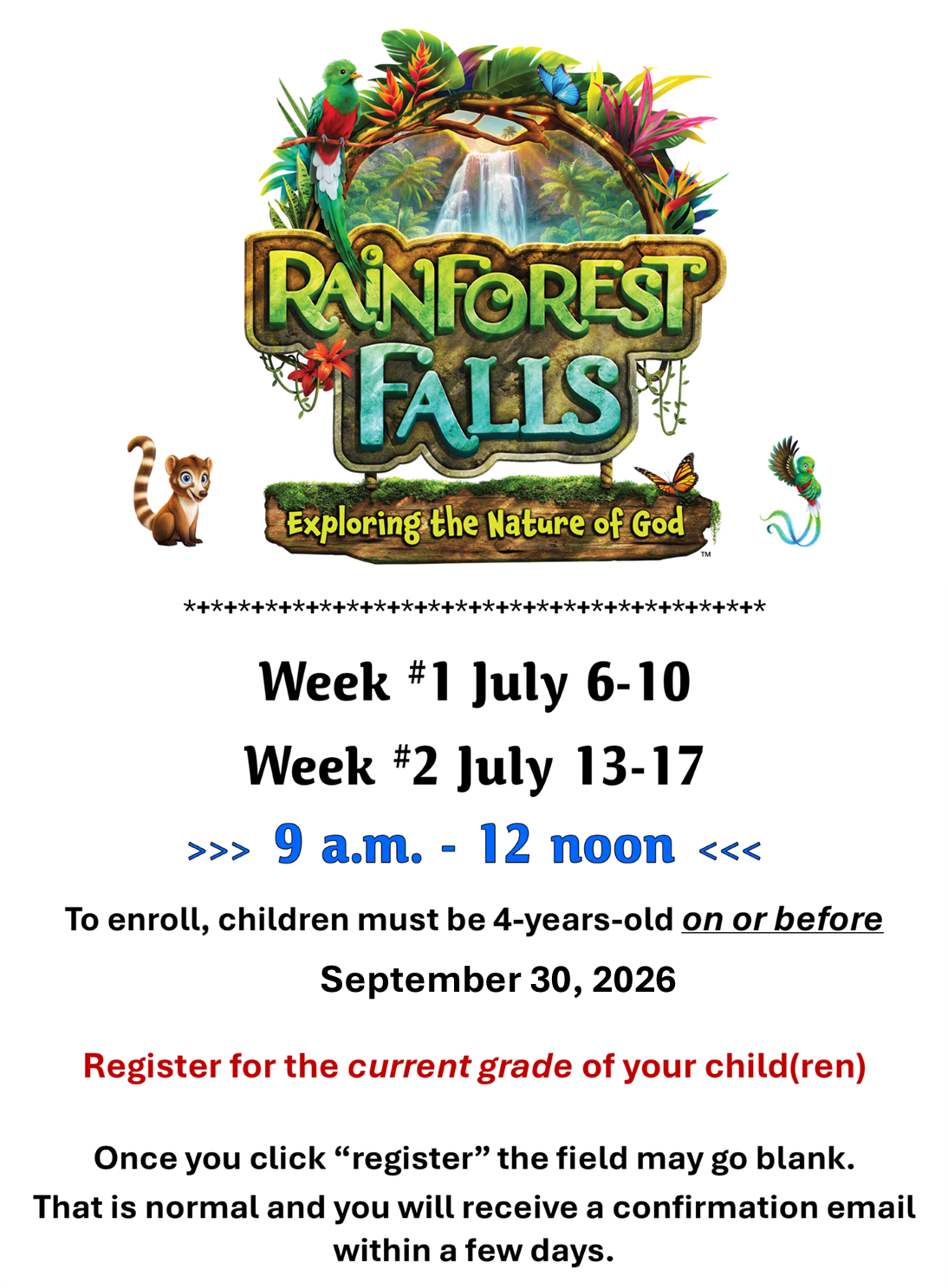 VBS Registration "*" indicates required fields CompanyThis field is for validation purposes and should be left unchanged.Parent InformationParent Name(s)*Best Phone Number*Address* Street Address ZIP / Postal Code Email Contact InformationName of Contact During VBS Hours*Contact Number*Select WeekSelect ONE Of the following weeks*Week 1 - July 6-10Week 2 - July 13-17Child InformationNumber of Children to Register 1 2 3 Child NameDate of Birth MM slash DD slash YYYY AgeTo enroll, children must be 4-years-old on or before September 30, 2026Pre-K 3Pre-K 4Pre-K 5Kindergarten1st Grade2nd Grade3rd Grade4th Grade5th GradeSecond Child NameDate of Birth MM slash DD slash YYYY AgeTo enroll, children must be 4-years-old on or before September 30, 2026Pre-K 3Pre-K 4Pre-K 5Kindergarten1st Grade2nd Grade3rd Grade4th Grade5th GradeThird Child NameDate of Birth MM slash DD slash YYYY AgeTo enroll, children must be 4-years-old on or before September 30, 2026Pre-K 3Pre-K 4Pre-K 5Kindergarten1st Grade2nd Grade3rd Grade4th Grade5th GradePlease list known food & medication allergies, plus special medical needs of your child:Help us to verify that this form is from a real person.